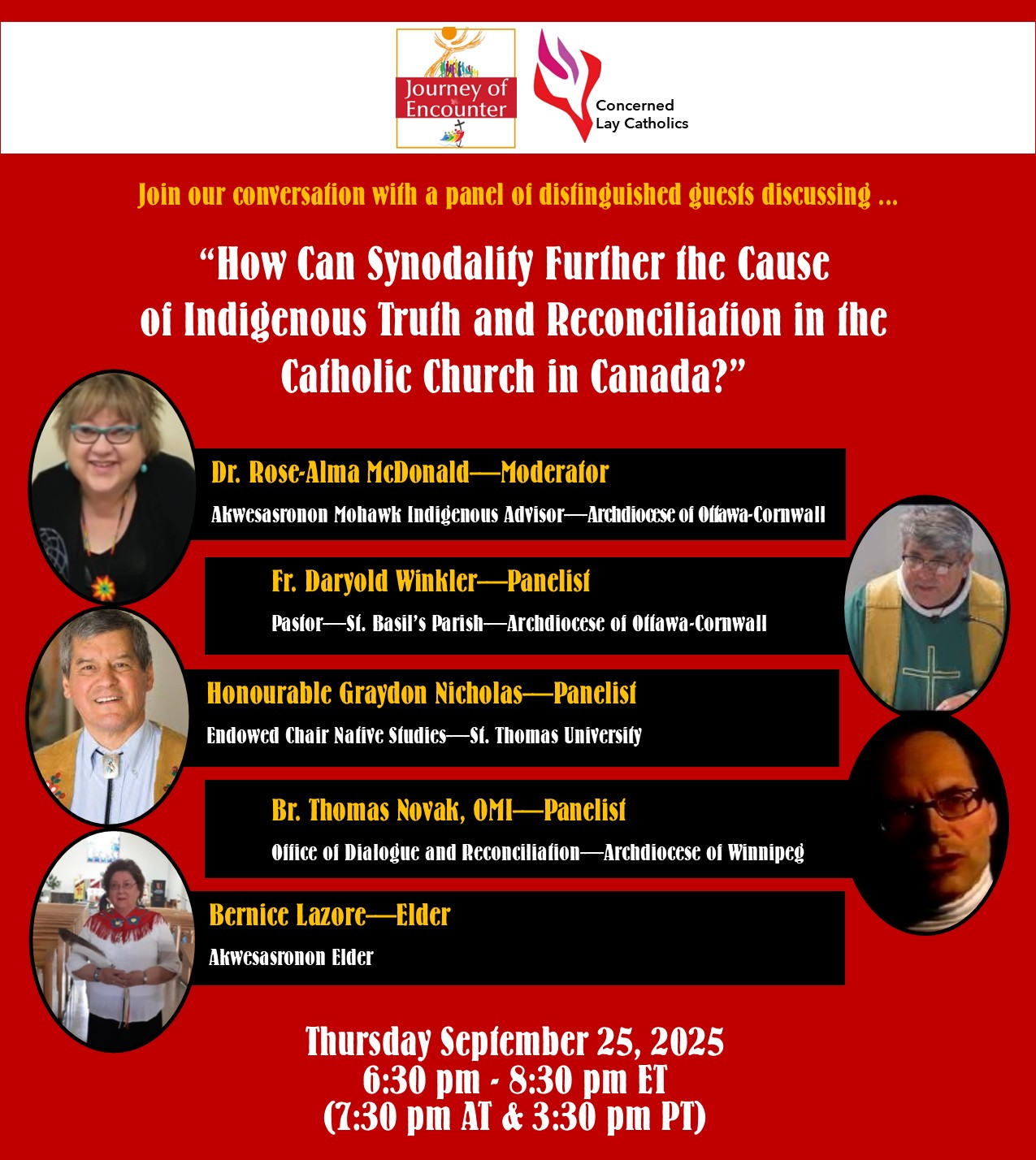 The basis of synodality is genuine listening and creating a culture of encounter where people really HEAR each other; not just react but come to understand another's experience. In this process, transformation of relationships becomes possible. Join us as we approach the National Day for Truth and Reconciliation in Canada. Listen to our distinguished panel of leaders from various Indigenous communities reflect on the implications of Synodality for Truth and Reconciliation in the Canadian context. What can Indigenous Catholics teach us about synodality? How might adopting a spirit of synodality open the church to greater inclusion of Indigenous voices? What role can each of us play- Indigenous, non-Indigenous, lay, clergy, religious, - in this transformation?